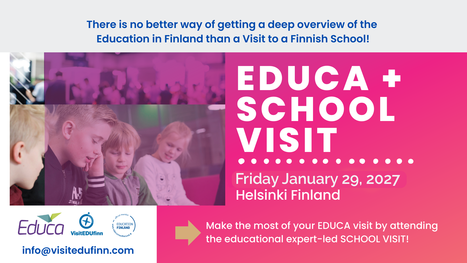 8:00 The visit starts in front of the Messukeskus; look for an Educa School Visit -sign at the Main entrance. During the trip, you will receive basic information about the Finnish educational system.